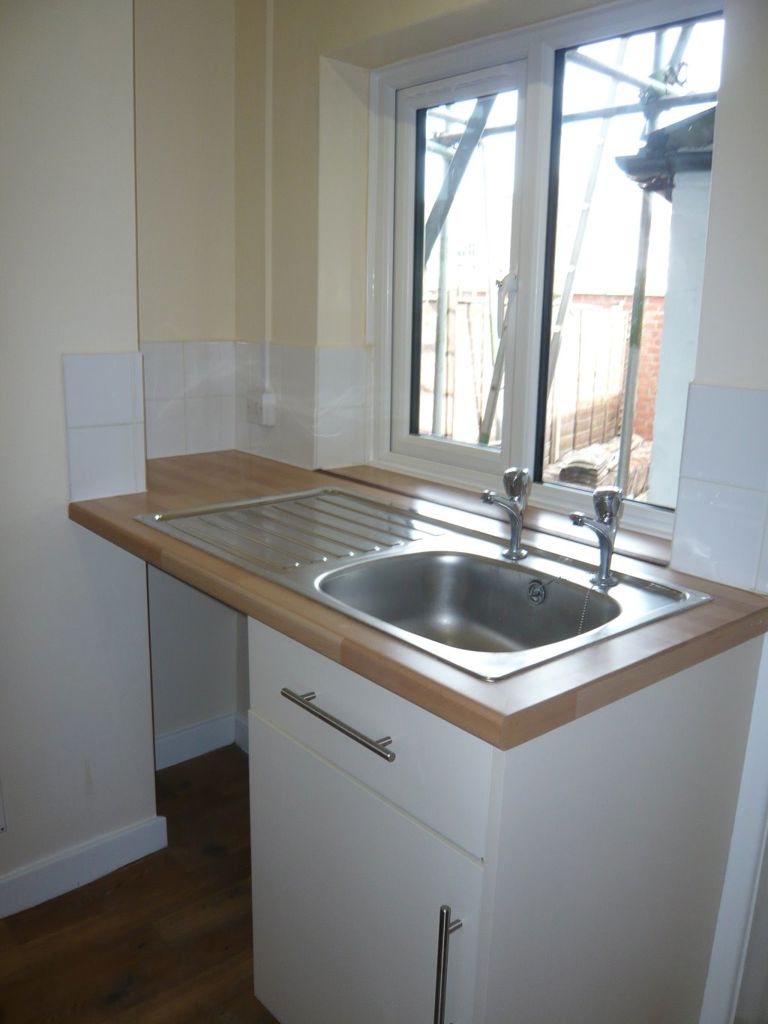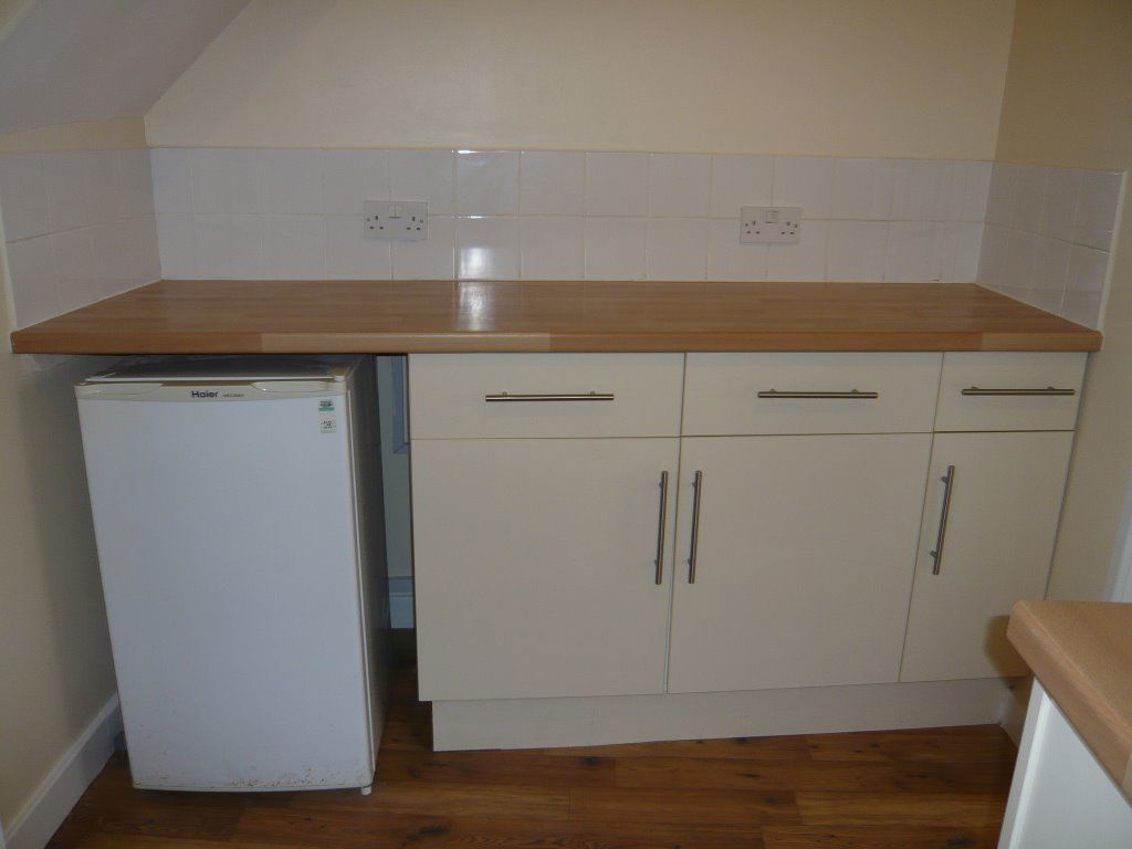 Through to a small modern kitchen with space for undercounter fridge, space for electric oven and washing machine.